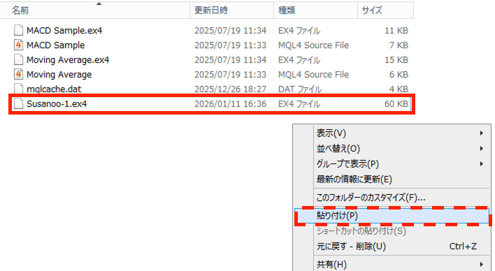 「Susanoo-○.ex4」をExpertsフォルダにご自身のPCからコピペしてください。