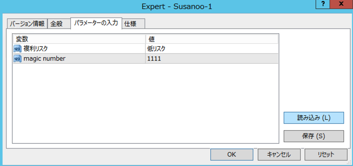「パラメーターの入力」タブをクリックして、「複利リスク」等を設定して下さい