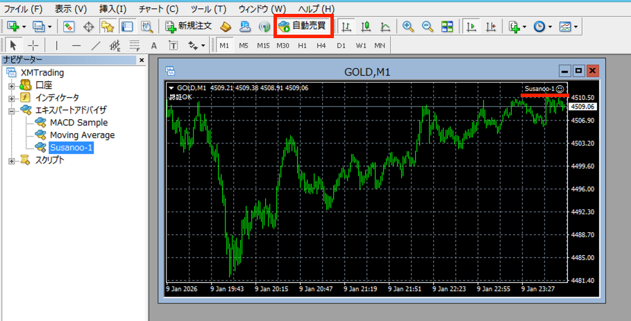 チャート左上に「認証成功」と表示されている状態で、「自動売買」ボタンをクリックすると運用が開始されます。