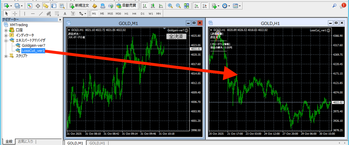 エキスパートアドバイザに(LossCut_Ver○.ex4)が表示されたら、先ほど開いたチャートにドラック&ドロップ