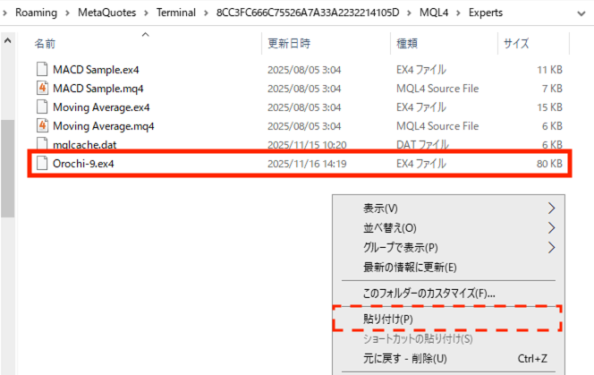 「Orochi-○.ex4」をExpertsフォルダにご自身のPCからコピペしてください。